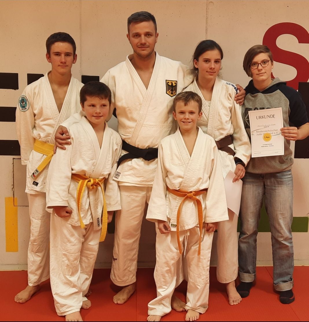 Ihre Vereinskameraden Leon Schimanski, Edwin Silbereisen und Hanke Hilmer waren mit angereist, um Sophie anzufeuern und anschließend beim Bundestrainer U18 mitzuhalten, obwohl sie noch U13 sind. Sie meisterten alle Übungen und Randoris (Übungskämpfe) hervorragend! Ein Abschlussfoto war dann der Lohn!